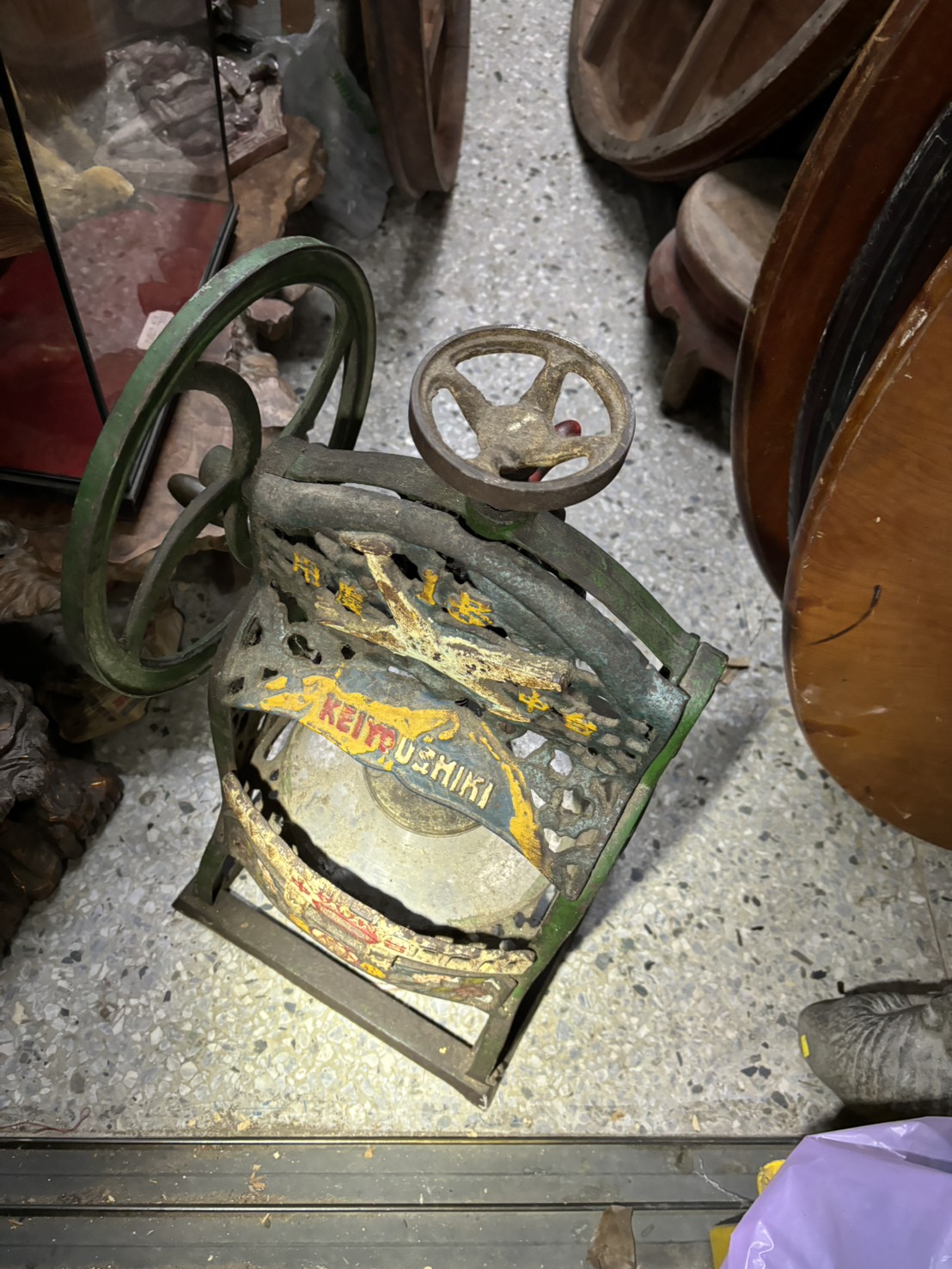 在古董倉庫的角落,這台「台中慶用一號古董手搖刨冰機」像個退役老將,綠油油的身軀滿是歲月痕跡,卻散發著最純粹的夏日魔力。