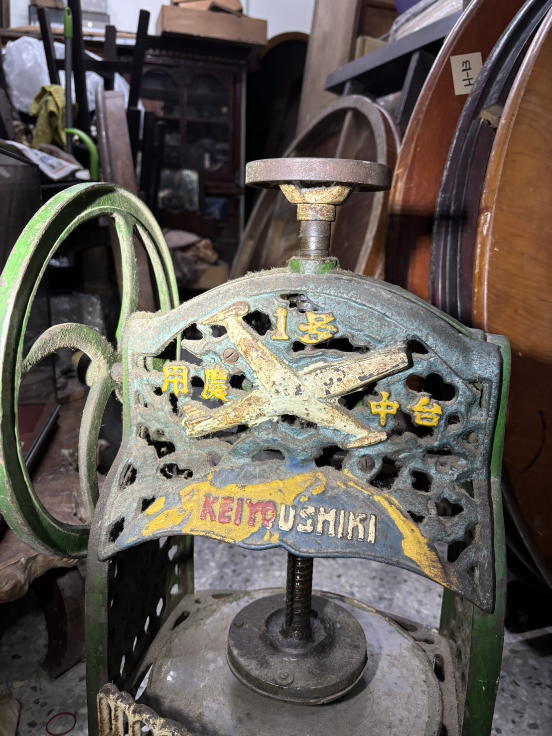 主體為鑄鐵打造,側邊大輪鏽跡斑斑,頂部醒目銘文「台中慶用一號」宣告其台中街頭出身,搭配日文「KEIYOU SMIKI」與蝴蝶花紋彩繪,融合日治時期工業美學與台灣早期蔗民記憶。 前方壓盤與刀刃設計經典,專為手工搖轉碎冰而生,底部穩固四腳架確保操作穩定,濃濃工業風也見證台灣經濟起飛的年代。